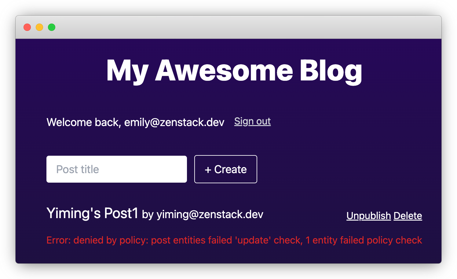 Now, open a new incognito window and sign up a new account emily@zenstack.dev. "Post1" should appear in her list, since our access policy allows all users to read published posts.